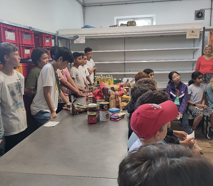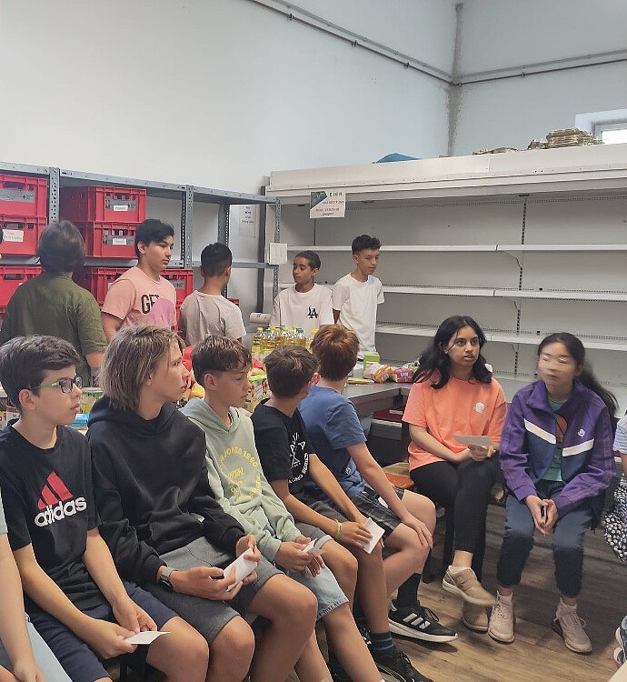 Jede Woche gibt es einen festen Ausgabeplan, nach dem die bedürftigen Menschen an bestimmten Zeitslots kommen und sich Lebensmittel abholen dürfen. In Moosburg darf man sich diese selbst aussuchen, weil es keine fest zusammengestellten Boxen o.Ä. gibt. Denn es wird besonders darauf geachtet, dass keine Lebensmittel verschwendet werden und wenn in einer Box etwa enthalten wäre, das man gar nicht verträgt oder mag, würde es womöglich weggeworfen werden. Genau das möchten die ehrenamtlichen Helfer und Helferinnen unbedingt vermeiden. Im Anschluss an den Vortrag konnten die Kinder noch Fragen stellen. Z.B. hat es sie interessiert, ob man evtl. auch mehrmals am Tag kommen dürfte, was jedoch verneint wurde. Außerdem wollten die Kinder wissen, wie man die Berechtigung erhält, also den Nachweis, dass man wirklich bedürftig ist. Den bekommt man nach einem Antrag bei der Caritas, erfuhren wir daraufhin. Letztlich hat es uns alle sehr beeindruckt, mit wieviel Engagement die Mitarbeiterinnen und Mitarbeiter in ihrer Freizeit für andere Menschen im Einsatz sind, denen es nicht gut geht. Zudem konnten es sich die Kinder kaum vorstellen, wie das wäre, dass der Kühlschrank zuhause plötzlich leer oder fast leer ist und man nicht einfach Einkaufen gehen und für Nachschub sorgen kann, ganz einfach, weil man das nötige Geld dafür nicht zur Verfügung hat. Vielen Dank an Frau Schmidbauer und Frau Prechtl, dass sie nicht nur so viel für unsere Mitmenschen in Not tun, sondern sich zudem noch Zeit für uns und unsere Fragen genommen haben!